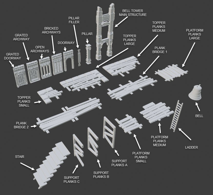Updated 8/29/21: Split the belltower for smaller printers, and updated the toppers to be in line with future releases (Crypts Coming September 21)